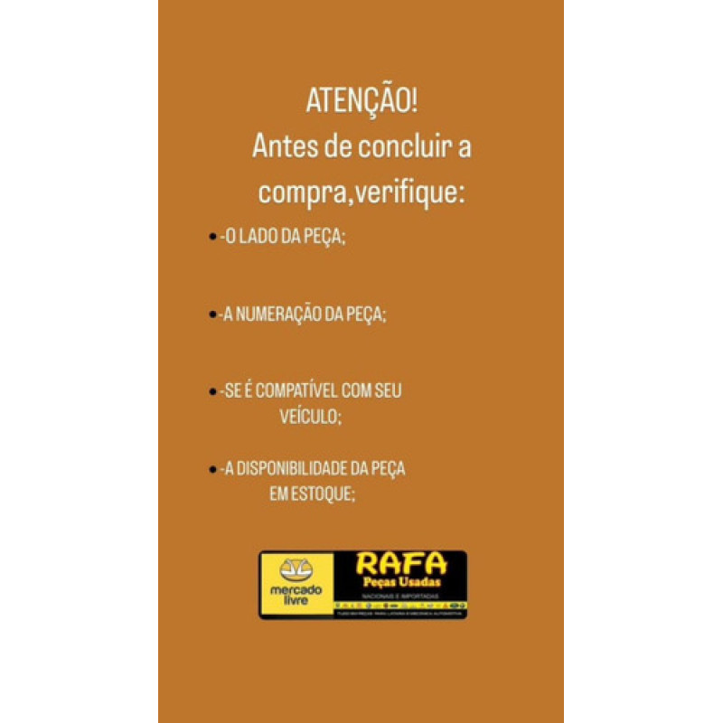 -Pedimos que por gentileza antes de efetuar a sua compra, tire todas as dúvidas com o vendedor, confira os códigos do produto com a sua peça, se possível mostre fotos disponíveis no anúncio para um técnico(mecânico), Para assim não comprar a peça errada causando transtornos desnecessário para ambas as partes.